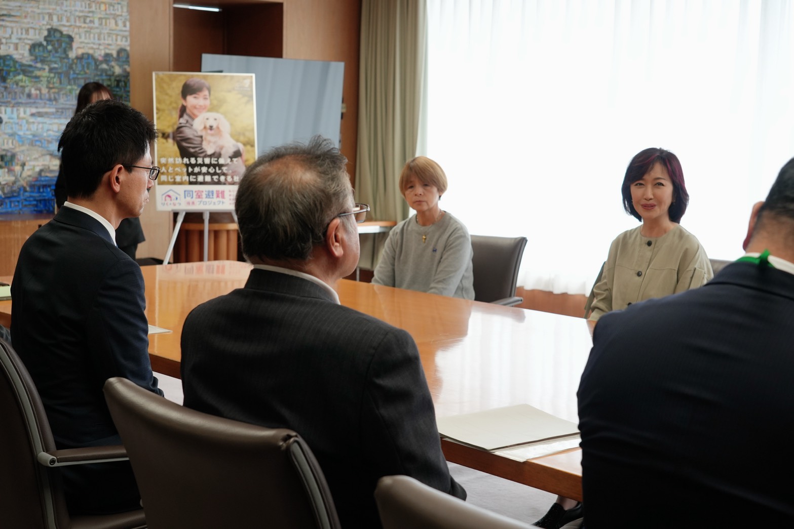 金指市長は「まずは避難所で避難できるということを知っていただかないといけないので、犬を飼う場合は必ず登録をいただき、その際に県の協会で作った同行避難の冊子をお渡しすると共に、職員が災害時には避難ができること、避難をするためのしつけや準備物などを説明をするようにしています。」と伝え、続けて「指定避難所は同室ではないですが、明らかに長期間見込まれてしばらく家に帰れそうにない場合などは、現状1カ所用意されている施設に移動し、同室避難という形を取れるようにしていくよう検討しています」と同室避難についても前向きに考えていることを伝えました。